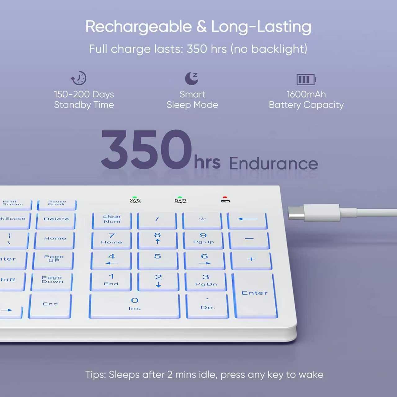 RECHARGEABLE & POWER-SAVING: Equipped with a 1600mAh rechargeable battery, this computer keyboard offers up to 350 hours of use without the backlight. Its ON/OFF switch and auto-sleep mode intelligently conserves energy