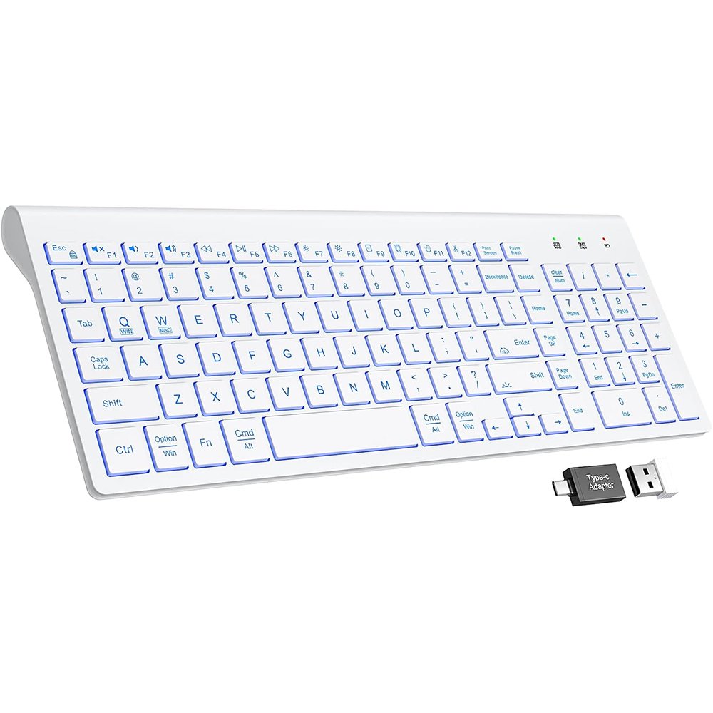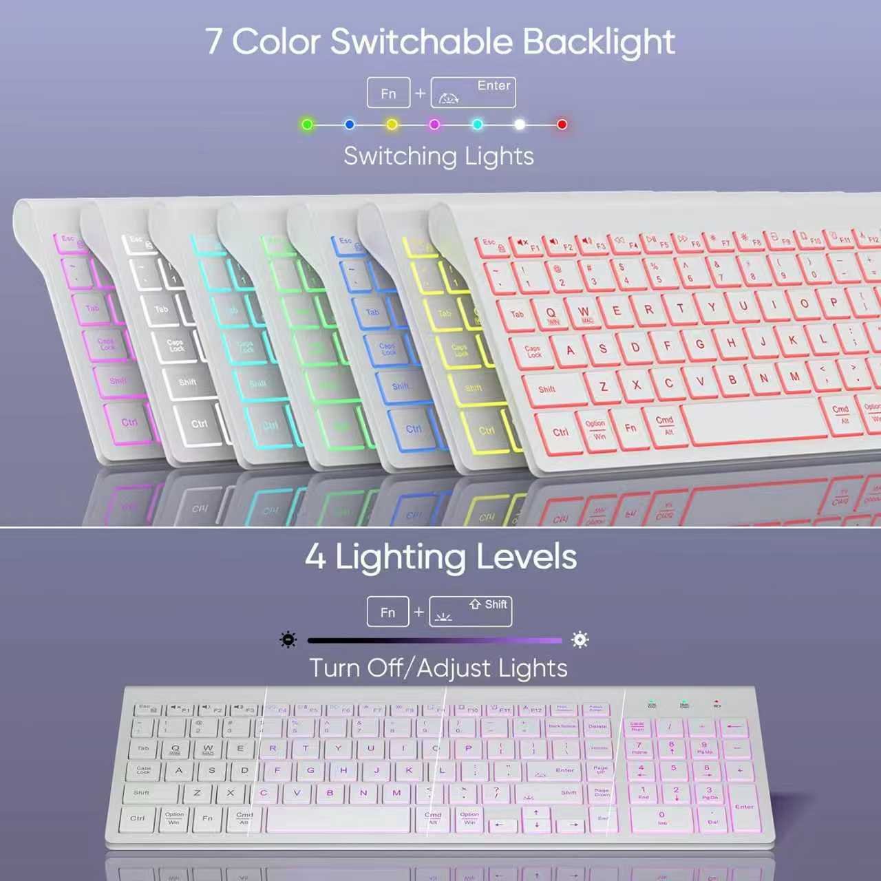 7 SWITCHABLE COLORS BACKLIGHT: This wireless keyboard boasts 7 customizable backlight colors and 3 brightness levels, providing clear visibility in dim settings. Personalize your lighting to enhance your typing atmosphere with both comfort and style