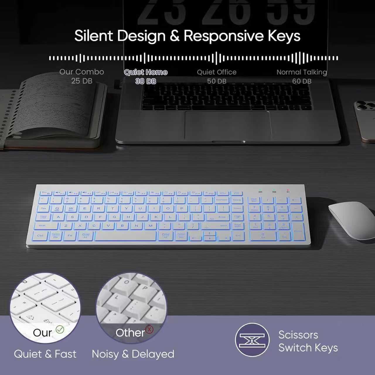 QUIET AND COMFORTABLE TYPING: The silent light-up scissor switch keys minimize typing noise by up to 95%, providing a laptop-like typing experience. The built-in 7°tilt angle and responsive keystrokes ensure comfort and efficiency